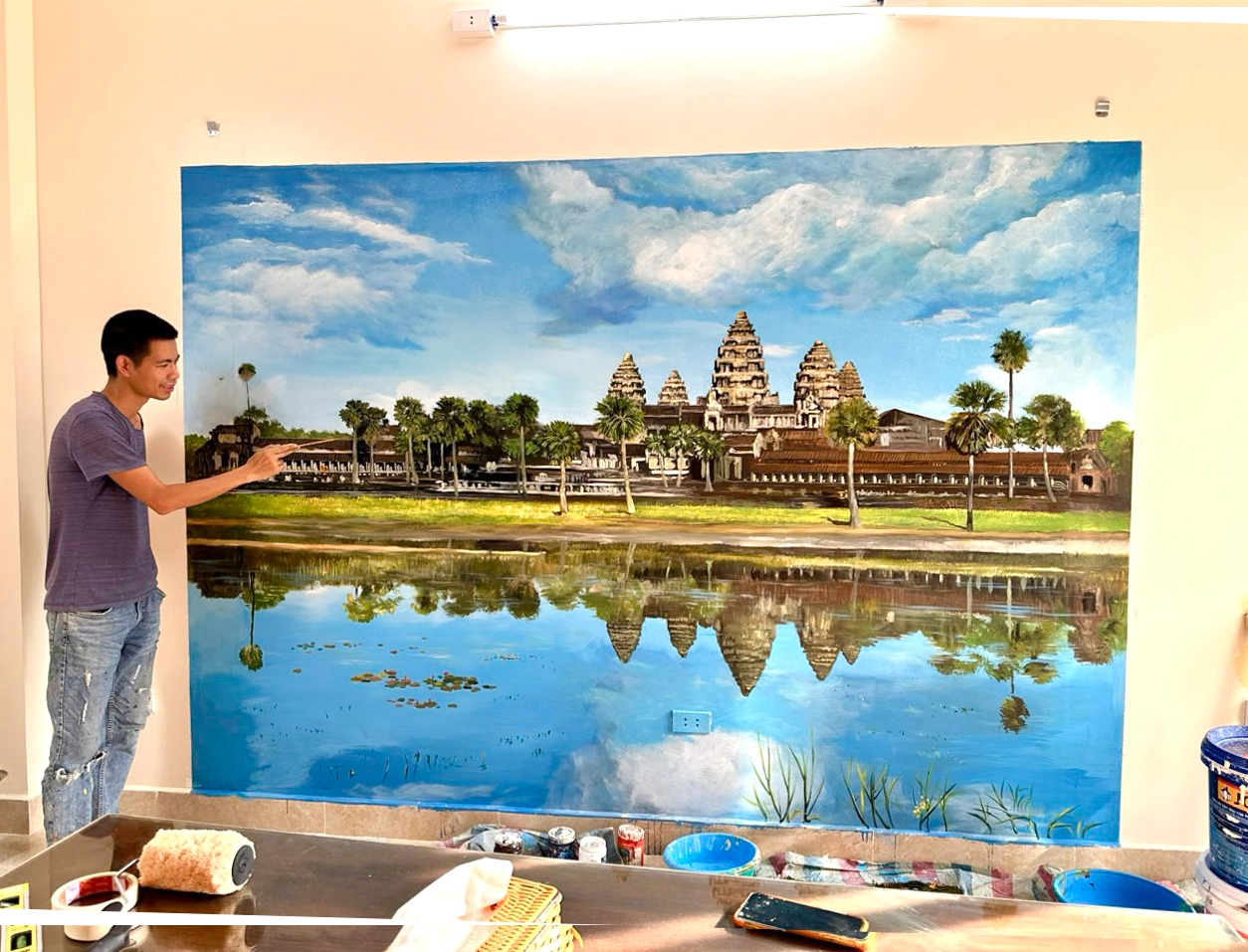 Tranh vẽ tường bức kỳ quan di tích đền Angkor cho cựu đại sứ tại kđt Văn Khê – Hà Đông – Hà Nội